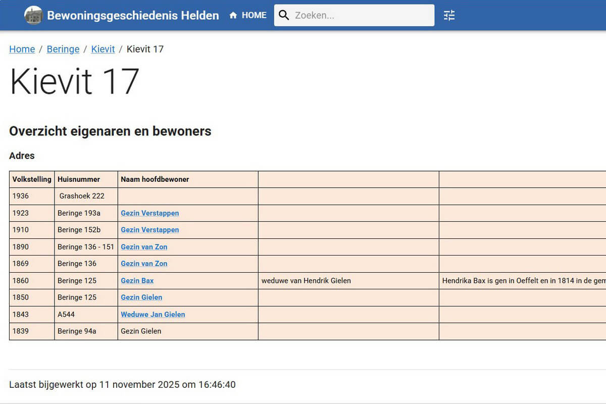 Ook nieuw is het huisnummerproject. Via een landkaart kan gekeken worden naar adressen in de voormalige gemeente Helden. Wanneer men klikt op een bepaald adres ziet men de bewoningsgeschiedenis. “We hebben de gegevens van de volkstellingen die bekend zijn vanaf 1839 in deze database verwerkt. Vervolgens kan men doorlinken daar de originele documenten die in die jaren zijn bijgehouden. We hebben de gegevens tot 1957”, zo vertelt Rob van ‘t Padje, webmaster van de Heemkundevereniging Helden, die met het project bezig is.
